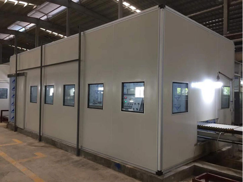 流水線靜音房的吸隔聲墻板厚度通常為110~200mm,為雙層墻體結構,外表面白色,是由不透氣的1.2~1.8mm的冷軋鋼板,經過沖壓,折彎,焊接,打磨,酸洗,噴涂等多道工序加工而成,在外墻附加的阻尼層是為了更好避免發生板的吻合效應和板的低頻共振,兩層墻體的間距是50mm以上,內填多孔吸聲材料,以吸收聲音并減弱空腔內的噪聲。吸隔聲墻板里沖孔板是3*3mm孔徑梅花狀排列的鍍鋅沖孔板,厚度為1.0mm~1.5mm不等。雙層隔音門都是向外開啟的,非常方便員工進出靜音房進行維護操作。