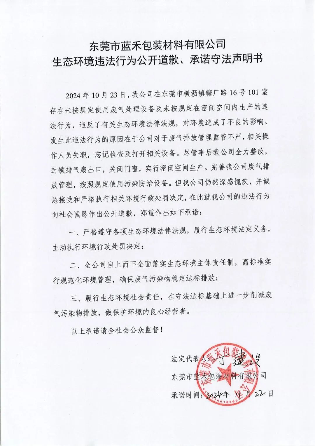 東莞市藍禾包裝材料有限公司生態環境違法行為公開道歉、承諾守法聲明書