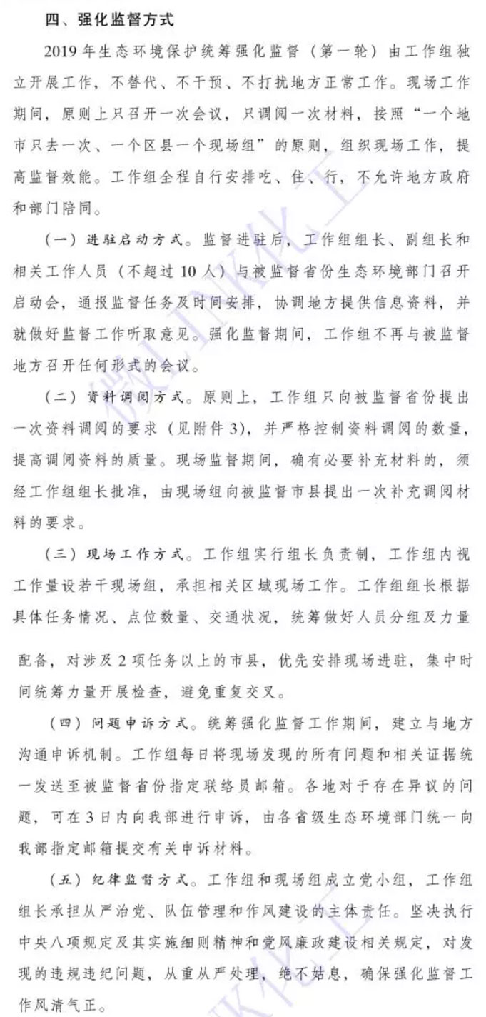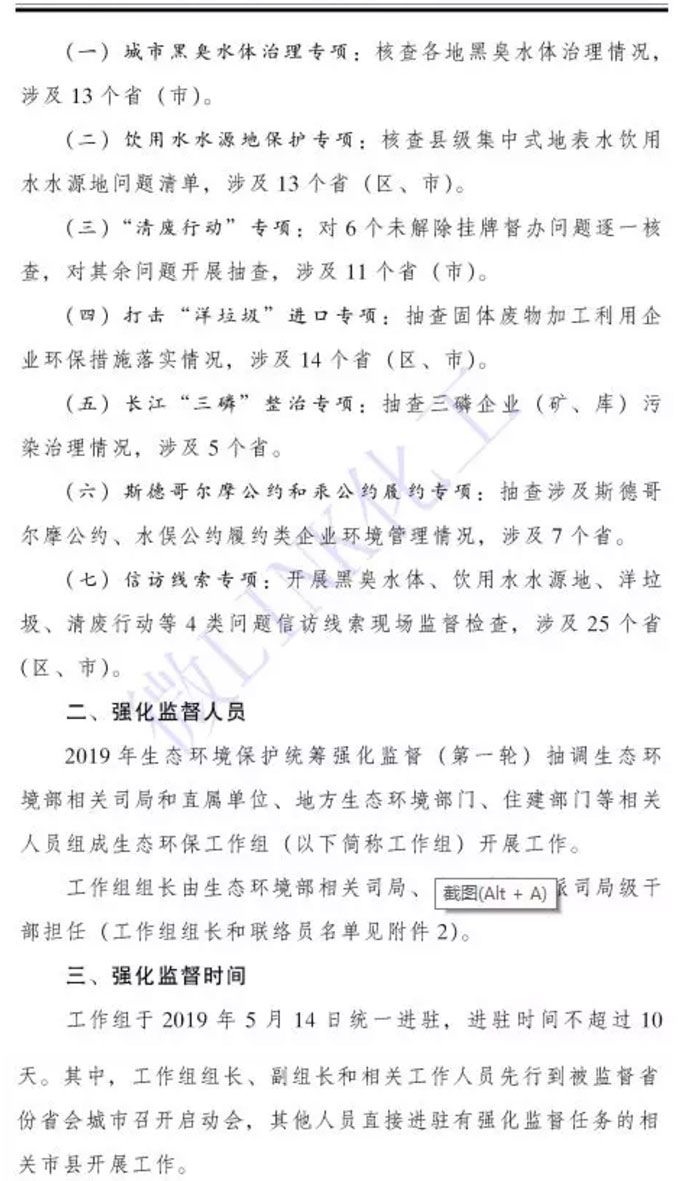 近期,生態(tài)環(huán)境部根據(jù)《統(tǒng)籌規(guī)范實施方案(試行)》要求,將對25個省市、自治區(qū)開展2019年生態(tài)環(huán)境保護統(tǒng)籌強化監(jiān)督。主要是對黨中央、國務(wù)院關(guān)于生態(tài)環(huán)境保護戰(zhàn)略部署落實情況、污染防治攻堅戰(zhàn)確定的重點任務(wù)和群眾關(guān)心的突出問題等工作進行監(jiān)督檢查,涉及城市黑臭水體治理、飲用水水源地保護、“清廢行動”、打擊“洋垃圾”進口、斯德哥爾摩公約和汞公約履約、信訪線索等專項檢查行動。此次統(tǒng)籌強化監(jiān)督抽調(diào)水體環(huán)境部相關(guān)司局和直屬單位、地方生態(tài)環(huán)境部門、住建部門等相關(guān)人員組成生態(tài)環(huán)保工作組,工作組獨立開展工作,實行工作組組長負責制,成立若個現(xiàn)場組,承擔相關(guān)地方現(xiàn)場監(jiān)督檢查工作。